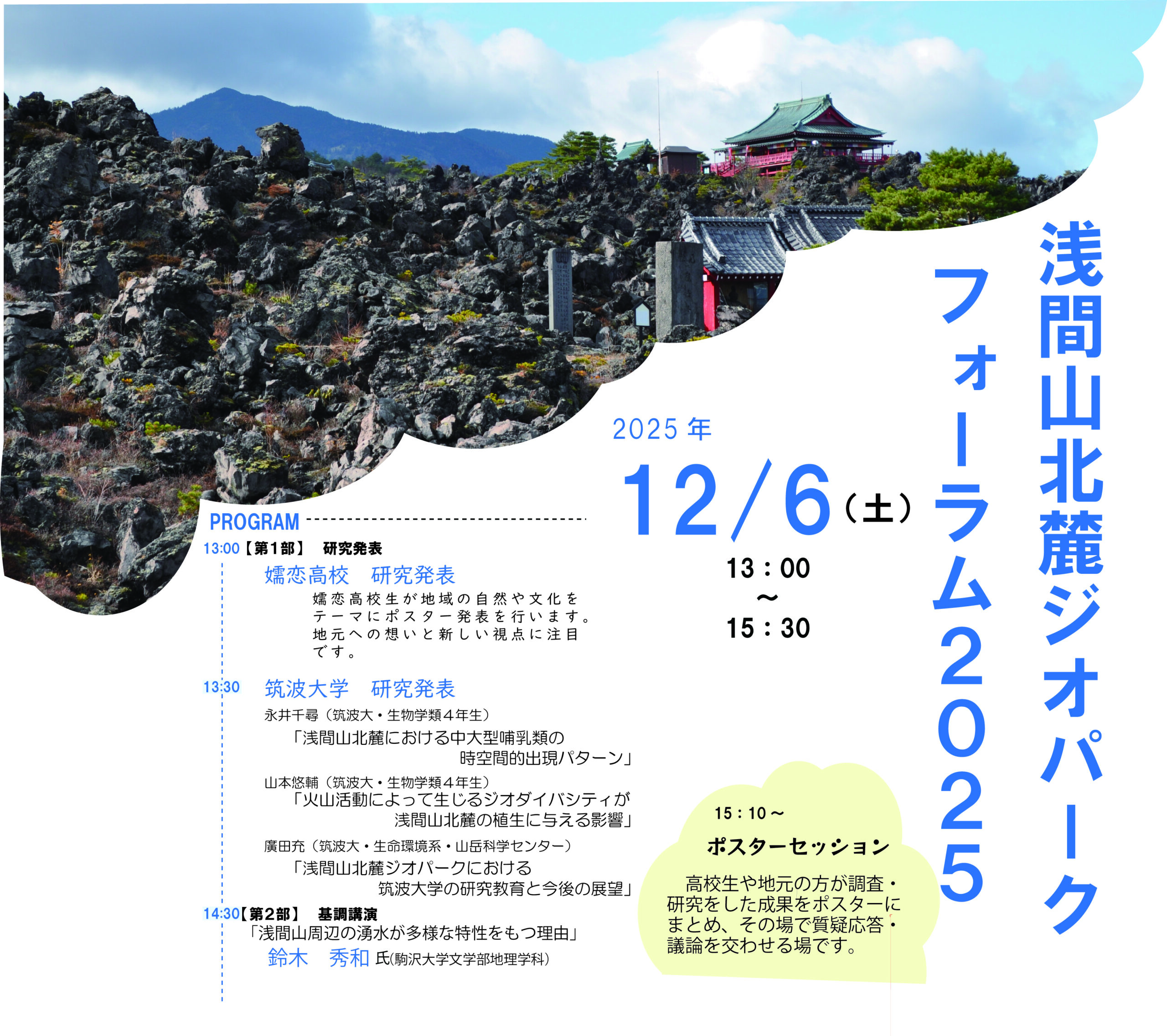 浅間山北麓ジオパークでは、地域のみなさんと一緒に浅間山北麓の魅力を楽しく学び、未来について考えるフォーラムを開催します。地元の高校生から大学の研究者まで、幅広い方々が登壇します。どうぞお気軽にお越しください!
